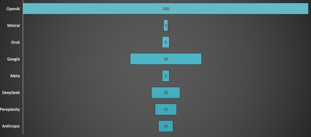 Les analystes prévoient un taux de croissance annuel de 25% portant le marché de l’IA de 240 milliards de dollars en 2025 à 850 milliards en 2030. Dans ce contexte, il est évident que le nombre d’acteurs évolue tous les jours. On se concentrera dans cet article de zoomer sur les 8 plus grands acteurs mondiaux (même si certains acteurs plus petits peuvent avoir un réel intérêt, soit pour desservir des secteurs d’activités spécifiques, pour garantir une meilleure souveraineté de la données, …)